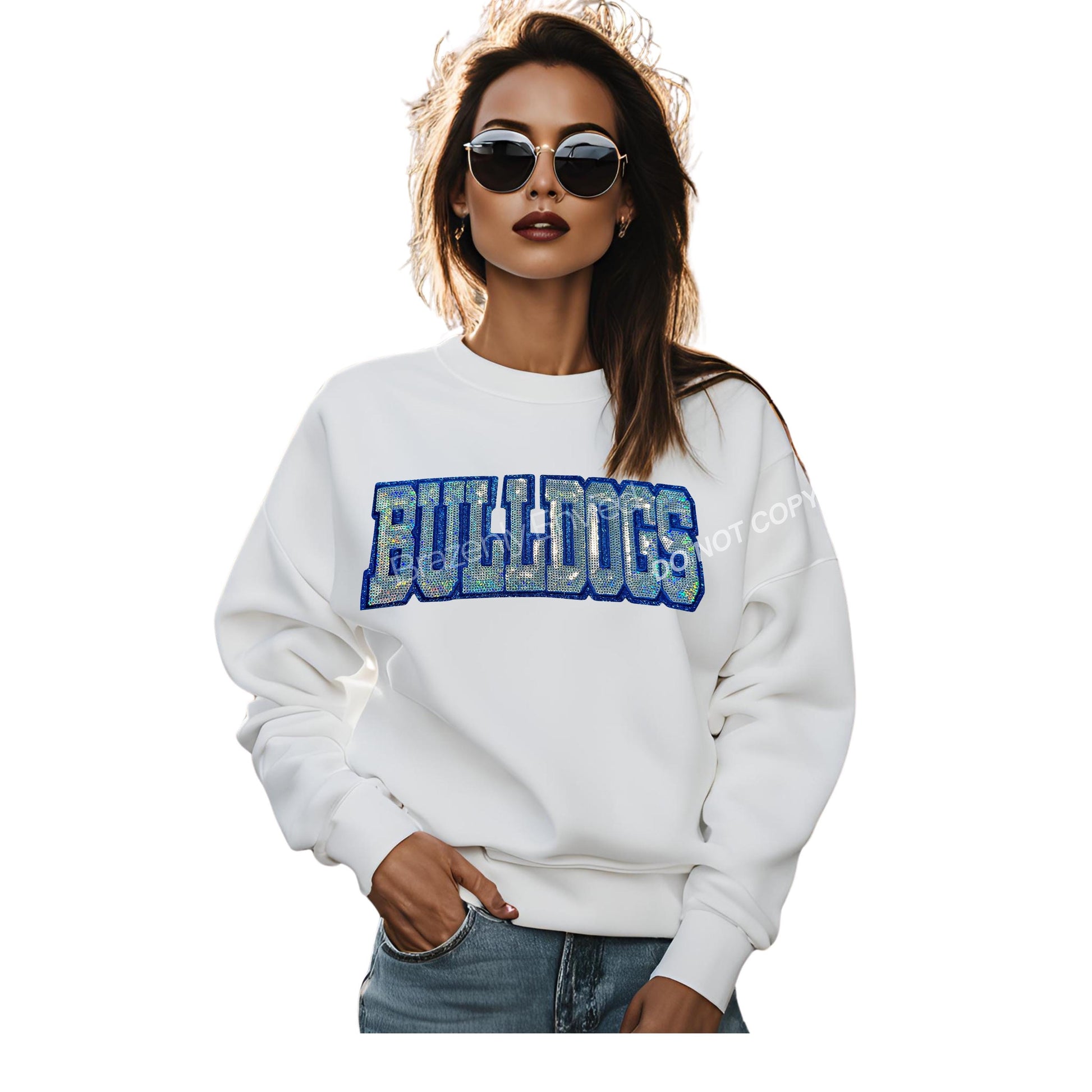 Bulldog Patch |Silver Sequins Bulldogs Block WORD Patch with Royal Blue Silver Backing