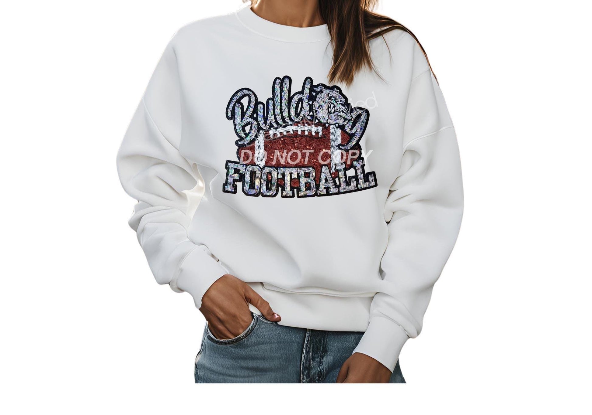 DO NOT COPY THIS DESIGN....Immediate ship Sequins BULLDOG FOOTBALL Patch - @ 11.25" W x 8.5" H - one single patch comes with adhesive backing that is heat activated, recommended to apply with a heat press. Can be used on apparel and bags.