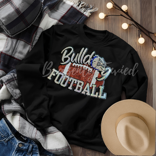 DO NOT COPY THIS DESIGN....Immediate ship Sequins BULLDOG FOOTBALL Patch - @ 11.25" W x 8.5" H - one single patch comes with adhesive backing that is heat activated, recommended to apply with a heat press. Can be used on apparel and bags.