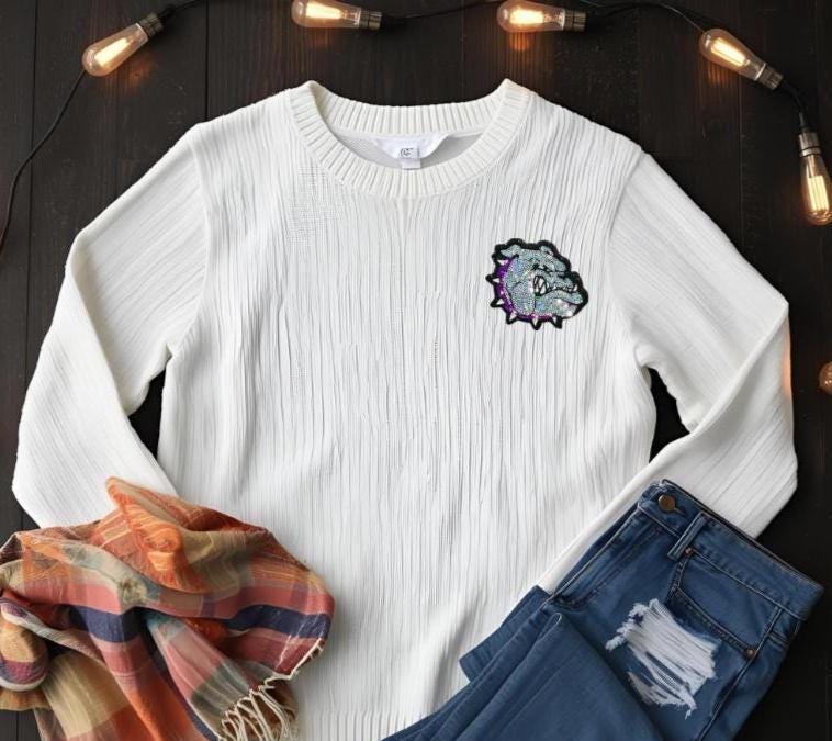 Ready to Ship -Sequins Bulldog with PURPLE collar Patch 3.5"H x 4"W- one single patch comes with adhesive backing that is heat activated, recommended to apply with a heat press. Can be used on apparel and bags. Do Not Copy or Replicate this Patch
