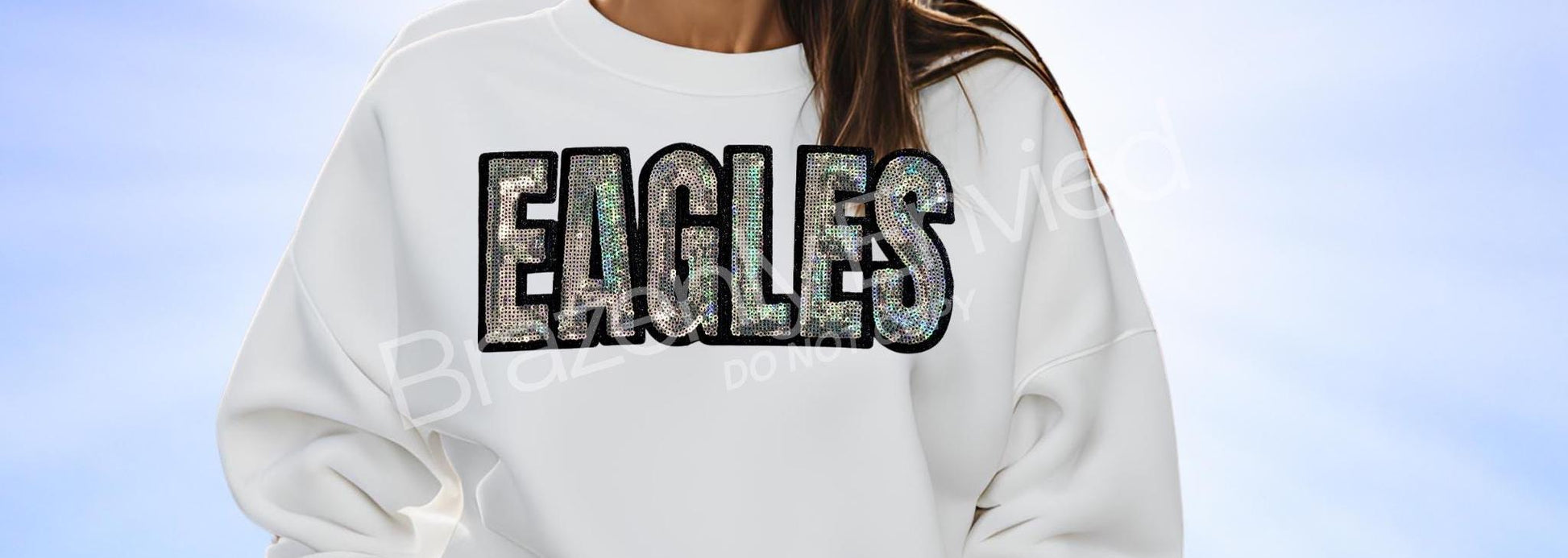 Ready to Ship -Silver Sequins /black backing Eagles Patch - @ 10.5" W x 4.5" H - one single patch comes with adhesive backing that is heat activated, recommended to apply with a heat press. Can be used on apparel and bags. DO NOT COPY or Replicate this Patch-