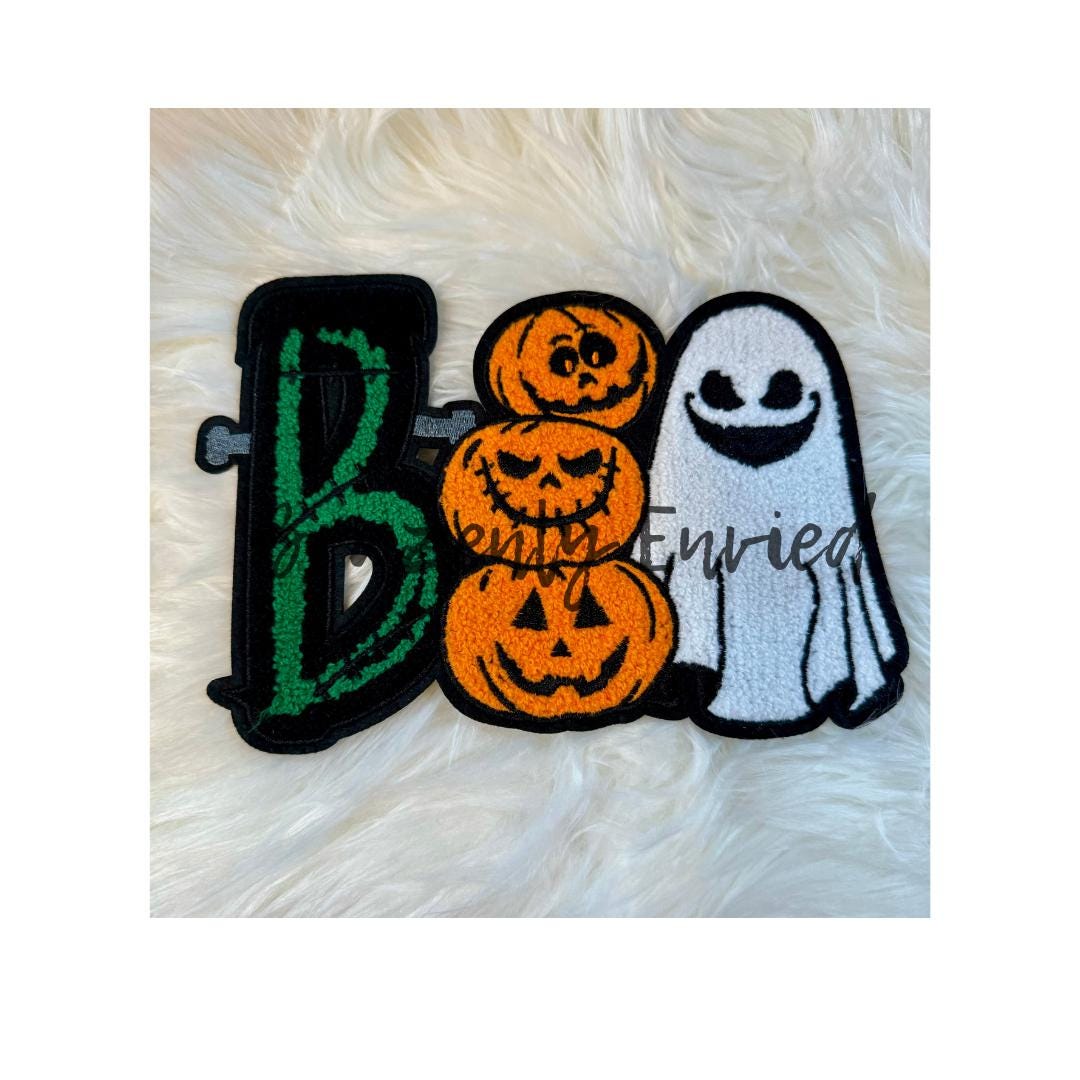 Boo Chenille - 6 in. tall x 8.25 in. wide - one single patch comes with adhesive backing that is heat activated, recommended to apply with a heat press. Can be used on apparel and bags.
