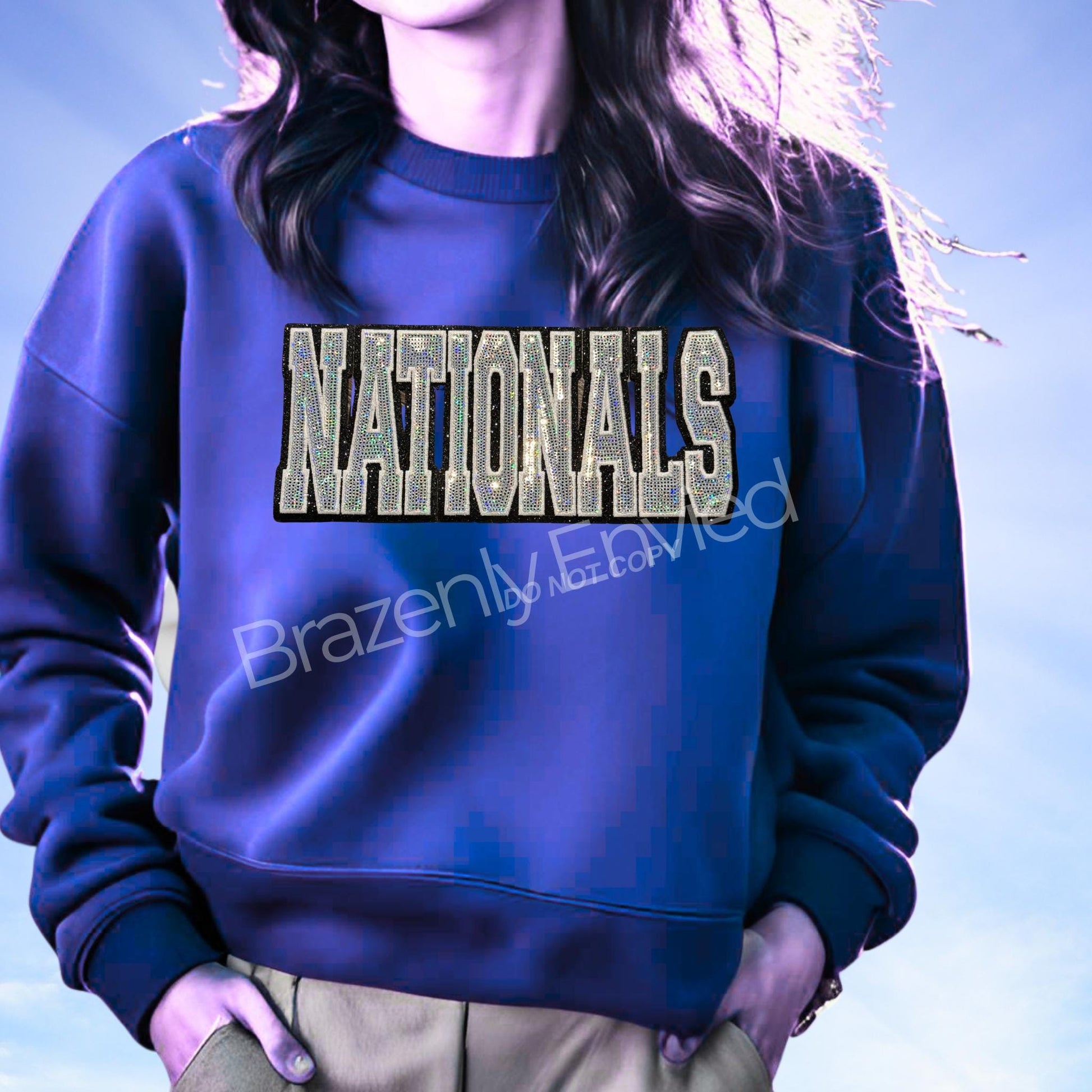 Great for Cheer and Dance Nationals. Immediate ship Sequins Nationals Patch @ 12 inch wide- comes with adhesive backing that is heat activated. Recommended to apply with a heat press. Can be used on Apparel and Bags