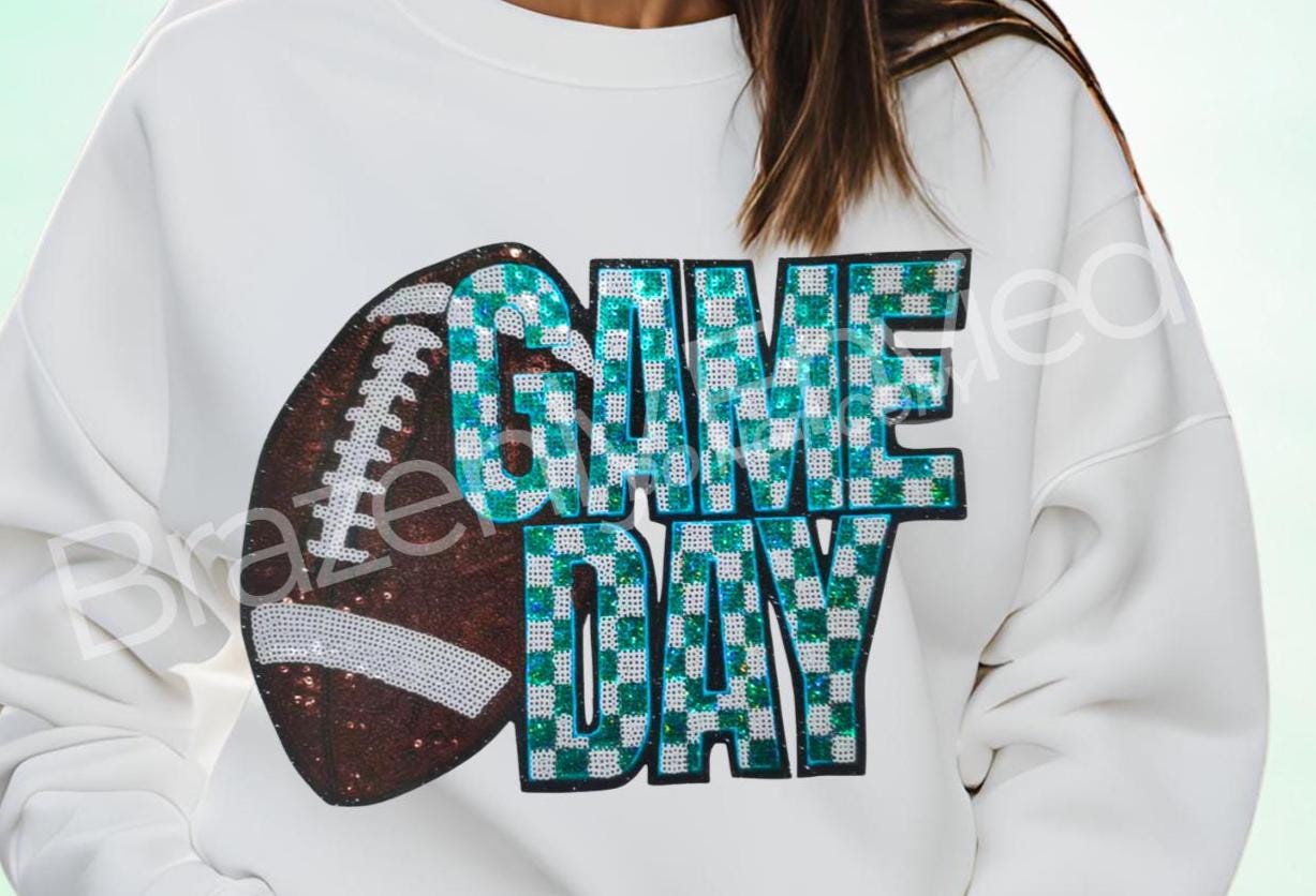 DO NOT COPY THIS CUSTOM PATCH-NEW Sequins Football TEAL checker board Pattern Game Day Patch - approximately @ 11 in. wide - one single patch comes with adhesive backing that is heat activated, recommended to apply with a heat press. Can be used on apparel and bags.