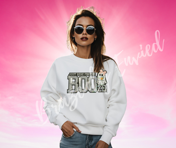 Sequins /Chenille Here for the Booze Patch - @ 11.5 H in. tall x 6n. wide - one single patch comes with adhesive backing that is heat activated, recommended to apply with a heat press. Can be used on apparel and bags.