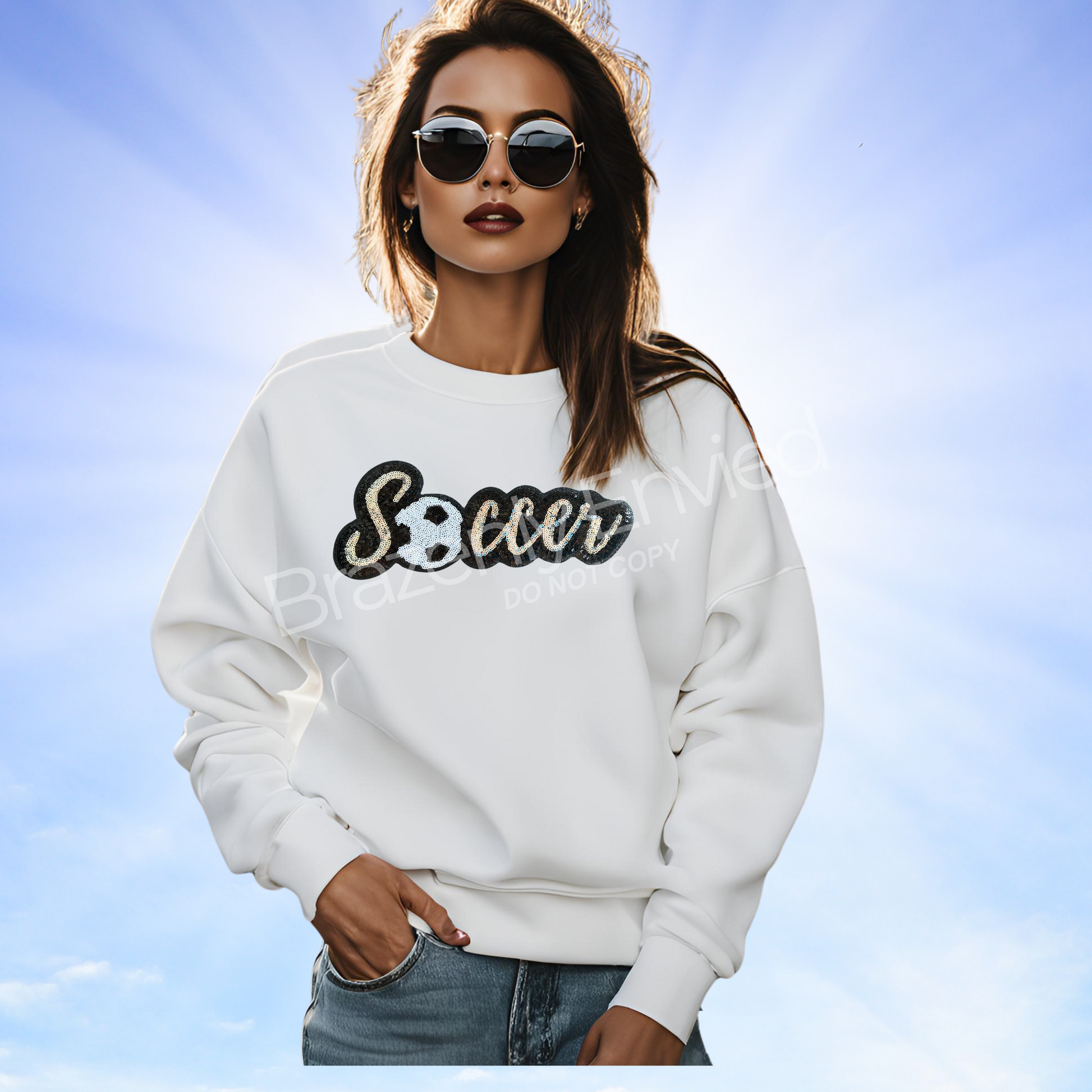 Immediate ship Sequins Game Day Soccer Patch - @ 4.5H in. tall x 11.5 in. wide - one single patch comes with adhesive backing that is heat activated, recommended to apply with a heat press. Can be used on apparel and bags.